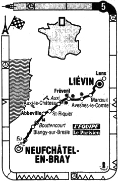Bruno Comillet continue à marquer des points pour le meilleur grimpeur dans la côte de la Forêt d'Eu, où il passe en tête et Unzaga passe en tête la côte de Bouttencourt. L'allure est très vive, de nombreux coureurs sont en difficulté. Le calme vient après la traversée d'Abbeville. Comillet passe encore en tête dans la côte d'Auxi-le-Château (km 79.5).