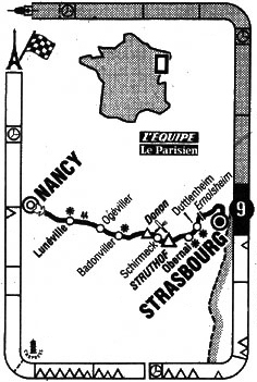 - Vichot passe en tête le sprint du km 138, le peloton est à 3'06" avec Bibollet et Rominger qui ont été repris. A 20 km du but, le peloton compte toujours 3' de retard. Ce sont les Toshiba qui assurent la poursuite. A 10 km de Strasbourg, les 9 échappés possèdent 2'40". Garde attaque à 10 km de l'arrivée. Pendant ce temps, Weinmann vient controuber à la poursuite des échappés.