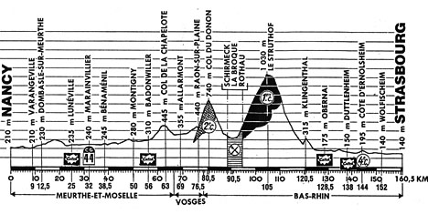 12h50 (Meurthe-et-Moselle) : Nancy - Tomblaine (km 0) - D2 Bosserville (km 2) - Art-sur-Meurthe (km 4) - Varangeville (km 9) - N4 Dombasle-sur-Meurthe (km 12.5) - Lunéville (km 25-sprint) - Marainvillier (km 32) - Thiébauménil (km 34.5) - Bénaménil (km 38.5) - Ogeviller (km 42.5) - D992 Montigny (km 50) - Sainte-Pole (km 51.5) - Badonwlller (km 56-sprint) - Col de la Chapelote (km 63) - Les Colins (km 66) - (Vosges) : D392 Allarmont (km 69) - Vexaincourt (km 72) - Luvigny (km 74) - Raon-sur-Plaine (km 76.5) - (Bas-Rhin) : Col du Donon (km 80.5-GPM2) - Grand-Fontaine (km 85.5) - Wackenbach (km 87) - La Broque (km 89.5) - Schirmeck (km 90.5) - N420 La Broque (km 91) - Rothau (km 93) - D130 Le Struthof (km 105-GPM1) - D214 La Rothlach (km 108) - D426 Klingenthal (km 120.5) - D 216 Boersch (km 123.5) - D322 Obernai (km 128.5-sprint) - D422 Bischoffsheim (km 130) - D127 Griesheim (km 134) - Altorf (km 135.5) - N420 Dutttenhelm (km 138-sprint) - D147 Gare de Duttlenheim (km 141) - Ernolsheim (km 143) - D793 Côte d'Ernosheim (km 144-GPM4) - D45 Breuschwickersheim (km 147) - Achenheim (km 149) - Oberschaeffolsheim (km 150.5) - Wolfisheim (km 152) - A350 entrée Strasbourg (km 159) - Strasbourg / av. de la Paix (km 160.5).