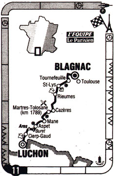 - L'allure est si vive que le peloton explose au km 47. 51 composent le peloton "maillot jaune" où figurent tous les favoris sauf Herrera et Breukink. Haex sort seul alors que le peloton se reforme au km 69 à St-Martory. Haex poursuit son effort et gagne la prime du sprint du km 1789.