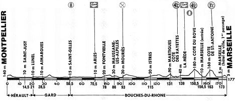 12h10 (Hérault) : Montpellier (km 0) - D24 Mauguio (km 7.5) - Lansargue (km 14.5) - Saint-Just (km 18) - Lunel (km 21) - (Gard) : N572 Aimarguès (km 28.5) - Vauvert (km 33.5) - Saint-Gilles (km 50.5) - (Bouches-du-Rhône) : N112 Arles (km 70.5-sprint) - D17 Abbaye-de-Montmajour (km 73.5) - Fontvieille (km 78) - Le Paradou (km 84.5) - Maussane-les-Alpilles (km 86) - Mouriés (km 93-ravitaillement) - N569 Istres (km 115) - Martigues - Côte des Rayettes (km 131) - N568 La Mède (km 139-sprint) - Côte du Rove (km 150.5-GPM4) - entrée Marseille (km 156.5) - Côte de Saint-Antoine (km 163-GPM3) - N8 Marseille-Viste (km 164.5) - Quai Dulazaret (km 170.5) - Quai de la Joliette (km 171.5) - Quai du port - Hôtel de Ville 1er passage (km 173) - Vieux-Port (km 173.5) - Quai de la Joliette (km 175.5) - Marseille (km 177).