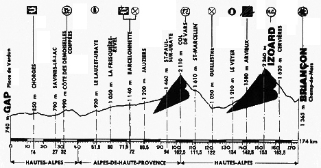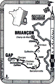 10h20 (Hautes-Alpes) : Gap (km 0) - Pont-Sarrazin (km 2) - La Batie Neuve (km 8) - Chorges (km 14-sprint) - Chapelle Saint-Michel (km 20.5) - Savinès-le-Lac (km 27) - D954 Les Eygeoires (km 28.5) - Côte des Demoiselles Coiffées (km 32-GPM3) - Le Sauze (km 37.5) - (Alpes de Haute-Provence) : D900 Le Lauzet-Ubaye (km 51.5) - Le Martinet (km 57) - La Fresquières-Revel (km 60) - Les Thuiles (km 65) - Barcelonnette (km 71.5-sprint) - Barcelonnette (km 72-ravitaillement) - Jauziers (km 80.5) - La Condamine (km 85) - Saint-Paul-sur-Ubaye (km 94) - Col de Vars (km 102.5-GPM1) - (Hautes-Alpes) : Les Claux (km 107) - Sainte-Marie (km 109.5) - Saint-Marcellin (km 111.5) - Guillestre (km 122-ravitaillement) - Le Serre (km 123) - Le Queyras (km 127) - Le Veyer (km 134) - Arvieux (km 142.5) - La Chalp (km 144) - Brunissard (km 145.5) - Col d'Izoard (km 153-GPM HC) - Le Laus (km 160.5) - Servières (km 162.5) - entrée Briançon (km 170) - Briançon / Côte de la Chaussée (km 174-GPM4).