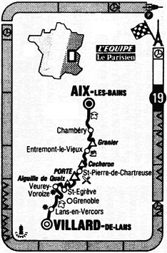 - En haut du Granier, les cinq sont toujours ensemble. Delgado passe en tête. Derrière, l'écart se creuse. En contre-attaque, à 3'05", Pino et Millar. Dans la descente, LeMond passe à l'attaque, mais sans succès.