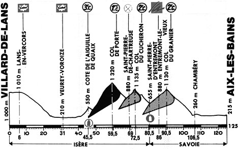 12h40 (Isère) : Villard-de-Lans (km 0) - D531 Les Geymonds (km 0.5) - Bouilly (km 3.5) - Lans-en-Vercors (km 6-sprint) - Engis (km 12.6) - Sassenage (km 24.5) - N532 Noyarey (km 28.5) - Veurey-Voroize (km 31-sprint) - Le Chevalon (km 34.5) - N75 Saint-Egrève (km 40.5) - D105A Côte de l'Aiguille-de-Quaix (km 45.5-GPM3) - Quaix-en-Chartreuse (km 47) - D57 Sarcenas (km 56) - D512 Col de Porte (km 59.5-GPM1) - D512 Saint-Pierre-de-Chartreuse-Ladiat (km 58) - Saint-Pierre-de-Chartreuse (km 69-ravitaillement) - Col du Cucheron (km 72.5-GPM2) - Saint-Pierre-d'Entremont (km 80.5) - (Savoie) : D912 Saint-Pierre-d'Entremont (km 81) - Entremont-le-Vieux (km 86) - Col du Granier (km 90.5-GPM2) - Jacob-Bellecombette (km 103) - Chambéry (km 106.5) - N220 ZI des Landiers (km 110.5) - N. 201 Voglaris (près de) (km 114.5) - Tresserve (km 122.5) - Aix-les-Bains / Bd. Robert Barrier (km 125).