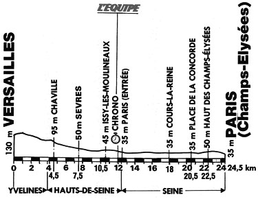 13h25 (Yvelines) : Versailles (km 0) - Viroflay/Av. du Général-de-Gaulle (km 3) - (Hauts-de-Seine) : Chaville/Av. Roger-Salengro (km 4.5) - Sèvres/Grande Rue (km 7.5) - N187 Meudon (km 9.5) - Issy-les-Moulineaux (km 10.5) - D50 Boulogne-Billancourt/Pontd'Issy (km 12) - (Seine) : D1 Paris/Quai St-Exupéry (km 12.5) - Voie Express Rive droite (km 14.5) - Av. de New York (km 16.5) - Cours Albert-1er (km 17.5) - Cours de la Reine (km 18) - Souterrain Concorde (km 18.5) - Quai des Tuileries (km 19) - Souterrain Lemonnier (km 19.5) - Rue de Rivoli (km 20) - Place de la Concorde (km 20.5) - Rond-Point des Champs-Elysées (km 21.5) - Haut des Champs-Elysées (km 22.5) - Rond-Point des Champs-Elysées (km 23.5) - Parsi/Champs Elysées (km 24.5).