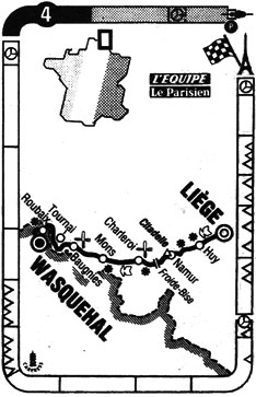 10h00 (BELGIQUE) (Liège) : N617 Liège (km 0) - Tilleur Saint-Nicolas (km 0.5) - Jemeppe (km 2.5) - Flemalle (km 4.5) - Engis (km 12) - La Maliève Saint-Georges (km 14) - Amay (km 20) - Huy (km 25.5-sprint) - N90 Huy Ben Ahin (km 28) - Gives (km 33.5) - (Namur) : Andenne (km 38-sprint) - Slayn (km 43) - Thon (km 46.5) - Maizeret (km 47.5) - Erpent (km 53) - Jambes (km 56) - N947 Namur (km 57) - N92 Namur Citadelle (km 59.5-GPM3) - Malonne (km 65.5) - Côte de Froide Bise (km 75-GPM4) - N922 Sart Saint-Laurent (km 76) - Fosses-la-Ville (km 80) - Vitrival (km 82) - Le Roux (km 84.5 ) - Presles (km 86.5) - Sart-Eustache (km 87) - (Hainaut) : Châtelet (km 92.5) - Chatelineau (km 95-sprint) - Montignies-sur-Sambre (km 99) - Charleroi (km 103.5-ravitaillement) - N90 Dampremy (km 105.5) - Fontaine-l'Evêque (km 113.5) - Anderlues (km 117) - Le Val-Trahegnies (km 120) - Binche (km 123) - Waudrez (km 125.5) - Bray (km 128) - Villiers-Saint-Ghislain (km 133) - Saint-Symphorien (km 135.5) - Mons (km 138-sprint) - N50 Ghlin (km 145) - N50 Baudour (km 151.5) - Tertre-Villerot (km 155) - Hautrage (km 156) - Bernissard (km 161) - Stamburges (km 162.5) - Quevaucamps (km 164) - Basècles (km 167.5) - Thumaide (km 169.5) - Bury (km 170.5) - Braffe (km 172) - Baugnies (km 174-ravitaillement) - Wasmes - Audenez - Briffœil (km 177) - Vezon (km 181) - Fontenoy (km 184) - Antoine - Peronnes (km 187) - Hollain (km 192.5) - Rongy (km 195.5) - Howardries (km 198) - Brunehaut-Lesdain (km 201) - Wez (203.5) - Ere (km 206.5) - Willemeau (km 210) - Froidmont (km 212) - Esplechin (km 214) - Lamain (km 217.5) - Hertain (km 218.5) - Blandain (km 220) - Moulinet (km 222) - Templeuve (km 226) - Forzeau (km 227) - Mechin (km 231) - Leers Nord (km 234.5) - Estaimpuis (km 238) - Herseaux (km 239.5) - (FRANCE) (Nord) : N350 Wattrelos (km 240) - D91 Leers (km 241) - D9 Roubaix (km 247.5) - Roubaix (km 249.5-sprint) - Tourcoing (km 251.5) - Mouvaux (km 252.5) - Marcq-en-Barœuil (km 253.5) - N350 Wasquehal (km 255).