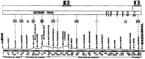 - Une longue accalmie s'ensuit mais la course est relancée à Binche au km 123 par Wegmuller. La chasse demeure toujours soutenue, ce qui n'empêche pas Wegmuller de compter 2'30" au km 172. L'approche des pavés est extrêmement rapide et à l'entrée du premier secteur au km 191 son avantage a fondu de moitié.