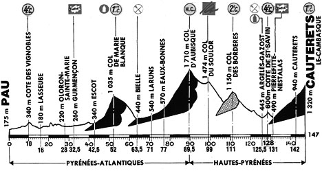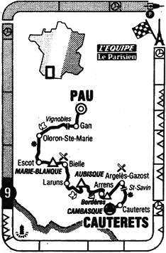 - Au pied de l'ascension de Cauterets, à 15 km du but, le peloton "maillot jaune" est à 6' d'Indurain. Rué assume un travail intense au profit de Fignon et à l'exception de Fuerte, tous les coureurs intercalés sont repris.