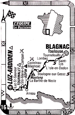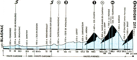 9h20 (Haute-Garonne) : Blagnac - D632 Tournefeuille (km 0) - Plaisance-du-Touch (km 5) - Fonsorbes (km 12) - Saint-Lys (km 16.5) - Sainte-Foy-de-Peyrolière (km 20-sprint) - Bragayrac (km 26.5) - (Gers) : Samatan (km 39.5) - Lombez (km 42) - (Haute-Garonne) : L'Isle-en-Dedon (km 56) - Anan (km 62) - Rebicherioulet (km 72) - D635 Saint-Pré-Delbosc (km 75.5) - Boulogne-sur-Gesse (km 78-sprint) - (Haute-Pyrénées) : D632 Thermes Magnoac (km 83.5) - Castelnau-Magnoac (km 91-ravitaillement) - D929 Gaussan (km 98) - Monlong (km 101.5) - Côte de Monlong (km 103-GPM3) - Réjaumont (km 108) - Lannemezan-la-Demi-Lune (km 112) - La Barthe-de-Neste (km 118) - Izaux (km 120) - Lortet Gare (km 122) - Hèches (km 125.5) - Rebouc (km 128) - Sarrancolin (km 131.5) - Arreau (km 138) - Col d'Aspin (km 150.5-GPM1) - La Séoube (km 159.5) - Sainte-Marie-de-Campan (km 163.5 - ravitaillement) - Gripp (km 168) - La Mongie (km 176) - Col du Tourmalet (km 180.5-GPM HC) - Barèges (km 191.5) - Esterre (km 198) - Luz-Saint-Sauveur (km 199) - D921 Saint-Sauveur stat.therm. (km 201.5) - D12 Sazos (km 204) - Grust (km 206) - Luz-Ardiden/Rte du SIVOM (km 215-GPM HC)