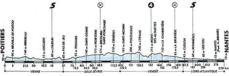 (Vienne) 10h00 : Poitiers - N1 Migné-Auxances (km 1) - Neuville de Poitou (km 8) - Etables (km 11.5) - Mirebeau (km 21.5) - Angliers (km 41.5) - Loudun (km 49-sprint) - (Deux-Sèvres) : D759 Pas-de-Jeu (km 61) - Orbé (km 73.5) - D838 St Jean de Thouars (km 75) - La Butte (km 82.5) - St-Gemme (km 84.5*) - Geay (km 88.5) - Noirterre (km 93.5) - Bressuire St Porchaire (km 98.5-ravitaillement) - Bressuire (km 102) - D960bis Breuil-Chaussée (km 107) - Cirrières (km 112.5) - Cerizay (km 116.5) - (Vendée) : D960bis St Mesmin (km 122.5) - Pouzauges (km 131) - D752 St-Michel-Mont-Mercure (km 138) - D755 L'Epaud (km 139) - Les Herbiers (km 149) - N160 Mont des Alouettes (km 152-GPM4) - D27 La Gaubretière (km 163) - D755 Les Landes-Gérusson (km 168) - La Bruffière (km 176.5-ravitaillement) - Cugand (km 184) - (Loire-Atlantique) : D59 Cisson (km 187) - Gorges (km 189.5) - Monnières (km 195-sprint) - St Fiacre (km 200.5) - La Bourchinière (km 201.5) - D59 Vertou (km 206) - St-Sébastien sur Loire (km 209) - D319 Les Landes (km 210) - Basse Goulaine (km 212) - D119 St Sébastien sur Loire (km 216) - entrée Nantes (km 217.5) - Nantes (km 228).