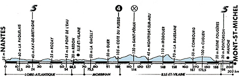 (Loire-Atlantique) 10h45 : Nantes - N137 Orvault la Conrée - Orvault le bourg (km 3.5) - La Paquelais (km 12.5) - D281 lieu-dit Les Planchettes (km 15.5) - Fay de Bretagne (km 24-sprint) - D164 Rozay (km 41) - Le Pont de l'Eau (km 54) - St Nicolas de Redon (km 58.5) - (Ile-et-Vilaine) : Redon (km 60.5) - (Morbihan) : D773 La Gacilly (km 75.5) - Guer (km 91) - école de Coëtquidan (km 96) - St Malo de Beignon (km 98.5) - Côte du Plessis (km 100-GPM4) - (Ile-et-Vilaine) : Piélan le Grand (km 106.5) - St Péran (km 114-ravitaillement) - D40 Les Quatre routes d'Iffendic (km 120) - D72 Montfort sur Meu (km 127) - Bédée (km 132) - Irodouer (km 140) - D20 Bécherel (km 145.5) - La Baussaine (km 150) - Tinténiac (km 155) - D79 Combourg (km 167) - D796 Tréméheuc (km 171.5) - Cuguen (km 175.5) - D90 Trans (km 183) - Pleine-Fougères (km 188) - Mont-Rouault (km 190.5) - N176 Villechérel (km 192) - (Manche) : Pontorson (km 194-sprint) - D976 Beauvoir (km 199.5) - Le Mont-Saint-Michel (km 203).