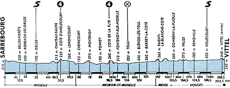 Saint-Paul (km 181) - Morelmaison (km 183) - Gironcourt-sur-Vraine (km 184.5) - D166 Houécourt (km 186.5-sprint) - D13 Belmont-sur-Vair (km 192) - D18 entrée Vittel (km 200.5) - Vittel/Rue du Lieutenant Gauffre (km 202.5).