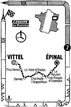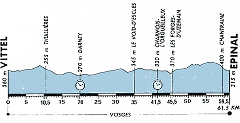 Vittel - D18 Thuiflières (km 10.5) - D164 Darney (km 19.5) - Le Void d'Escles (km 35) - D3 Charmois l'Orgueilleux (km 41.5) - Les Forges d'Uzemain (km 45.5) - D51 Le Roulon (km 51) - Chantraine(km 59.5) - entrée Epinal (km 60) - Epinal (km 61.5)
