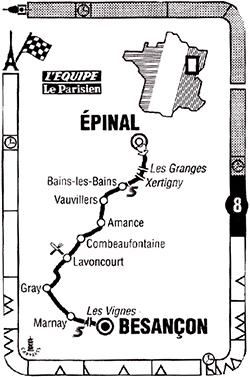 - Au sprint bonification du km 163, Ruttimann passe en tête. Un groupe de 15 coureurs, parmi lesquels de nombreux sprinters, s'échappe dans les rues de Besançon et n'est pas revu.