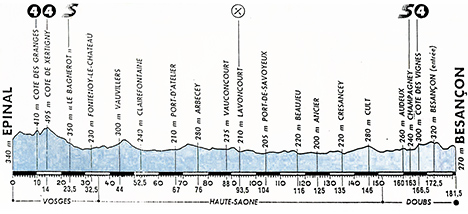 Cuit (km 146) - (Doubs) : Audeux (km 160) - D70 Champagney (km 163-sprint) - Pouilley-les-Vignes (km 165) - Côte des Vignes (km 166.5-GPM4) - Pirey (km 167) - entrée Besançon (km 172.5) - Besançon/Bd. de la Grette (km 181.5).