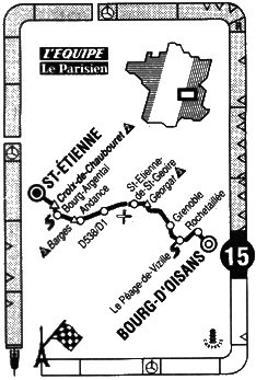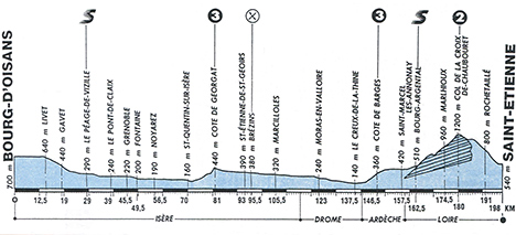 11h15 (Isère) : N91 Bourg d'Oisans (km 0) - Rochetaillée (km 5.5) - Livet (km 12.5) - Rioupéroux (km 15.5) - Les Clavaux (km 18) - Gavet (km 19) - Séchilienne (km 23) - Le Péage-de-Vizille (km 29-sprint) - N85 Basse-Jarie (km 34) - Le Pont-de-Claix (km 39) - N75 Echirolles (km 42.5) - Grenoble (km 45.5) - N532 Seyssinet-Pariset (km48) - Fontaine (km 49.5) - Sassenage (km 52) - Noyaret (km 56.5) - Grand-Jean (km 65) - Saint-Quentin-sur-Isère (km 70) - D45 Tullin-Fures (km 74.5) - Renage (km 80) - Côte de Georgat (km 81-GPM3) - D519 Izeaux (km 86) - Sillans (km 88.5) - Saint-Etienne-de-Saint-Geoirs (km 93) - D518 Brézins (km 95.5-ravitaillement) - D519 Marcilloles (km 105.5) - D1 Moras-en-Valloire (km 123) - Saint-Sorin-en-Valloire (km 125.5) - Anneyron (km 131-sprint "prime de l'abricot") - N7 Le Creux-de-la-Thine (km 137.5) - D1 Andancette (km 140) - (Ardèche) : D86B Andance (km 141) - D 82 Saint-Etienne-de-Valoux (km 143) - Côte des Barges (km 146.5-GPM3) - Saint-Cyr (km 148) - Davezieux (km 149.5) - N82 Boulieu-lès-Annonay (km 154) - Saint-Marcel-lès-Annonay (km 157.5) - (Loire) : Bourg-Argental (km 162.5-sprint) - D29 Marlhioux (km 174.5) - Col de la Croix-de-Chaubouret (km 180-GPM2) - D3 Le Bessat (km 181) - Rochetaille (km 191) - entrée Saint-Etienne (km 195) - Saint-Etienne / Cours Fauriel (km 198).