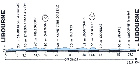 11h25 (Gironde) : D670 Libourne (km 0) - Loiseau (km 1) - Fronsac (km 3.5) - Saint-Michel-de-Fronsac (km 6) - La Rivière (km 7) - Saint-Germain-la-Rivière (km 9.5) - Lugon (km 11.5) - D138 Villegouge (km 14.5) - Galgon (km 19) - D10 Saint-Ciers-d'Abzac (km 25) - Saint-Martin-en-Laye (km 29.5) - Guitres (km 33) - D910 Montigaud (km 38) - Laguirande (km 39) - D17 Lagorce (km 41.) - Coutras (km 46) - D674 Frappe (km 55) - D910 Les Billaux (km 59) - entrée Libourne (km 59.5) - Libourne / av. Georges-Clemenceau (km 63.5).