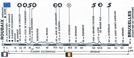 12h20 (FRANCE) - (Nord) : Roubaix - Wattrelos/poste frontière- (BELGIQUE) - (Hainaut) : N450 Herseaux (km 0) - Dottignies (km 4-sprint "Europe...") - (Flandre Occidentale) : N512 Espierres (km 8) - N353 Helchin (km 11) - Bossuit (km 13) - Outijve (km 15) - (Hainaut) : N391 Escanafflies (km 18) - Orroir (km 19) - Mont de l'Enclus (km 22-GPM4) - (Flandre Occidentale) : Berchen (km 26) - N36 Côte de Kwaremont (km 29-GPM4) - Renaix (km 36-sprint) - N60B Le Kreusberg (km 37-GPM4) - N8 Audenarde (km 45.5) - N8 Roman (km 51) - Brakel (km 58) - N493 Parike (km 62) - Mur de Grammont (km 70.5-GPM3) - Le Bosberg (km 74.5-GPM4) - Vaarbeke (km 77) - (Brabant) : Vollezele (km 86) - Oettingen (km 88.5-ravitaillement) - N28 Leerbeek (km 93) - Perpingen (km 97) - Halle (km 104) - Essenbeck (km 107) - Braine-le-Château (km 111) - Wauthier-Braine (km 107) - Braine-l'Alleud (km 120-sprint) - Dworp (km 126) - Côte de Bruine Put (km 127.5-GPM3) - Lot (km 130.5) - Saint-Pieters Lew (km 134) - Vlezenbeek (km 137) - Dibeek (km 139.5) - Schepdaal (km 141) - Wambeek (km 145) - Ternat (km 148) - Saint-Martin-Bodegem (km 149.5) - Saint-Ulriks-Kapellen (km 151) - Groot Bijgaarden (km 154) - Zellik (km 158) - Relegem (km 159) - Wemmel (km 161) - entrée Bruxelles (km 164) - Bruxelles / Bd. du Centenaire (km 167)
