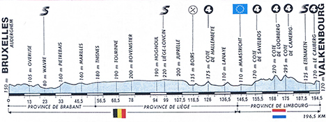12h10 (BELGIQUE) - (Brabant Bruxelles) : Bruxelles - Woluwe Saint-Pierre - Auderghem (km 0) - Tervuren (km 3) - Duisburg (km 5.5) - Eizen (km 8.5) - N4 Overijse (km 13) - Wavre (km 23-sprint) - N268 Archennes (km 26) - N240 Grez Doiceau (km 29) - Bossut Gotechain (km 31.5) - Pietrebais (km 33) - Melin (km 35) - Jodoigne (km 42) - Marilles (km 46.5) - Enines (km 47) - Jauche (km 50) - Jandrain (km 52) - (Liège) : Thisnes (km 56.5) - Hannut (km 58.5) - N69 Villiers-le-Peuplier (km 63) - Avennes (km 63.5) - Lens Saint-Rémy (km 64.5) - Tourinne (km 68.5) - Omal (km 70.5) - N637 Faimes (km 76) - Bovenistier (km 78) - Limont (km 80) - Jeneffe (km 83.5) - N3 Hognoul (km 94) - Liège Loncin (km 99-sprint) - Xhendremael (km 104) - Juprelle (km 107.5) - Villiers Saint-Siméon (km 109.5) - Slins Juprelle (km 112) - Glons (km 114.5) - N618 Boirs (km 116.5-ravitaillement) - Rocienge-sur-Geer (km 117.5) - Bassenge (km 120) - N619 Vonck (km 121.5) - N671 Côte de Hallembeye (km 126-GPM4) - Hacou (km 128) - Haccourt (km 129) - N618 Vise (près de) (km 131) - Lixhe (km 133.5) - Lanaye (km 136.5) - Eben-Emmael (km 140.5) - Kanne (km 142.5) - (HOLLANDE) (Limbourg) : Maastricht (km 146.5) - Gronsveld (km 153.5) - Côte de Savelbos (km 155.5-GPM4) - Saint Geertruid (km 157) - Mheer (km 160) - Noorbeck (km 162.5) - Slenaken (km 166.5) - Côte de Loorberg (km 168-GPM4) - Heyenrath (km 168.5) - Eperheide (km 170) - Epen (km 171.5) - Camerig (km 172.5) - Côte de Camerig (km 175-GPM4) - Viljen (km 178) - Hileshagen (km 179.5) - Partij (km 182.5) - Wittem (km 183.5) - Wijlre (km 185.5) - Etenaken (km 187.5-sprint) - Schoonbron (km 188) - Schin Op Geul (km 189) - Oud Valkenburg (km 190) - entrée Valkenbourg (km 191.5) - Le Cauberg (km194.5-GPM4) - Valkenbourg-Vitt / Rijks-weg (km 196.5)