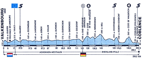 10h00 (HOLLANDE) - (Limbourg) : Valkenburg - Sibbe (km 0) - Ijzeren (km 0.5) - Scheulderr (km 1.5) - Ingber (km 3.5) - Gulpen (km 6) - N278 Nijswiller (km 11.5) - Lemiers (km 14.5) - Vaals (km 17) - (ALLEMAGNE) - (Nordrhein - Westfalen) : B1 Aachen (km 23.5) - B264 Haaren (km 26) - Haaren (km 27.5-sprint) - Wurselen (km 29) - Eschweiler (km 37.5) - L238 Eschweiler-Durwiss (km 40) - K28 Eschweiler-Weisweiler (km 45) - B264 Langerwehe (km 48) - Duren (km 57.5) - B56 Soller (km 67) - Zulpich (km 76) - Ulpenich (km 80) - Durcheven (km 82) - Elsig (km 83.5) - Euenheim (km 85) - Euskirchem (km 89.5) - Kuchenheim (km 92.5) - B266 Oberdrees (km 99.5) - Wonnersdorf (km 106.5) - Ersdorf (km 108.5) - Altendorf (km 109) - (Rheinland - Pfalz) : L83 Gelsdorf (km 111) - Vettelhoven (km 113.5) - Bollingen (km 116) - Lantershofen (km 118) - Bad Neuenahr-Arhweiler (km 120-ravitaillement) - Côte de Bad Neuenahr (km 128-GPM4) - Konigsfeld (km 131.5) - L88 Dedenbach (km 133) - Rodder (km 136) - Niederzissen (km 138.5) - L82 Vehr (km 143.5) - Bell (km 149) - L120 Mendig (km 153) - B256 Thur (km 156) - K20 Mayen-Hausen (km 159.5) - B258 Ochtendung (km 169-sprint) - L117 Kobern-Gondorf (km 176.5) - L208 Waldesch (km 189.5) - Côte de Waldesch (km 190.5) - B9 Rhens (km 197.5) - Koblenz - Stolzenfels (km 200.5) - entrée Koblenz (km 202.5-sprint) - Koblenz (Coblence) / Hohen-Zollern Strasse (km 206.5).