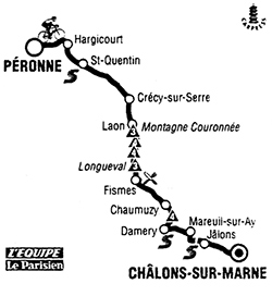 12h06 (Somme) : Péronne (km 0) - D6 Marquaix Hamelais (km 7.5) - Roisel (km 9) - Templeux-le-Guérard (km 14) - (Aisne) : D331 Hargicourt (km 16) - D57 Villeret (km 17.5) - D31 Pontru (km 23) - D57 Fresnoy-le-Petit (km 27) - Fayet (km 29) - Saint-Quentin (km 33.5-sprint) - D12 Neuville-Saint-Amand (km 37.5) - Mesnil Saint-Laurent (km 39) - Sissy (km 45.5) - D58 Ribemont (km 47.5) - D12 Villers-le-Sec (km 52) - La Ferté-Chevresis (km 58.5) - Montigny-sur-Crécy (km 62) - Crécy-sur-Serre (km 65) - D967 Laon (km 79) - Côte de la Montagne-Couronnée (km 82.5-GPM3) - Bruyères et Montberault (km 88.5) - Côte de Montberault (km 92.5-GPM4) - Monthenault (km 94) - Chamouille (km 95.5) - Cerny-en-Laonnois (km 99) - Côte de Cerny-en-Laonnois (km 100-GPM4) - Bourg-et-Comin (km 105.5) - Longueval-Barbonval (km 110) - Côte de Longueval (km 112-GPM3) - (Marne) : Fismes (km 117-ravitaillement) - D386 Courville (km 121) - Cruny (km 125) - Serzy-et-Prin (km 127) - Savigny-sur-Ardres (km 128) - Faverolles-et-Coemy (km 130) - Tramery (km 131.5) - Poilly (km 133.5) - Sarcy (km 134.5) - Chaumuzy (km 139) - Marfaux (km 141.5) - Côte de Nanteuil (km 148-GPM4) - D22 Fleury-la-Rivière (km 151.5) - Damery (km 156-sprint) - D1 Cumières (km 158.5) - Ay (km 164) - Mareuil-sur-Ay (km 168) - Athis (km 178-sprint) - Jâlons (km 181.5) - Aulnay-sur-Marne (km 183.5) - Matouges (km 186.5) - Saint-Gibrien (km 191.5) - Fagnières (km 193) - entrée Châlons-sur-Mame (km 194.5) - Châlons-sur-Marne / av. Paul-Doumer (km 199).