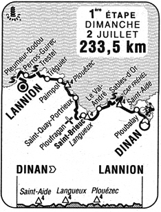 - Il n'y a rien d'important à signaler jusqu'au km 114, où Boscardin démarre en vain. Chiappucci secoue le peloton après l'escalade des falaises de Plouézec au km 146,5. Passages en tête : François Simon qui vise le gain du maillot à pois. Erik Dekker est le premier échappé du Tour au km 160. Il prend jusqu'à 2' au sprint du km 188.