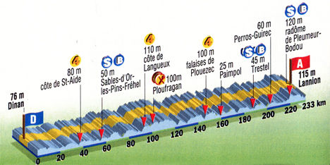 11h41 (Côtes d'Armor) Dinan/Place du Champ - Dinan (km 0) - Pleslin-Trigavou (km 7.5) - D2 Ploubalay (km 17.5) - Notre-Dame du Guildo (km 26.5) - Matignon (km 31.5) - Côte de Saint-Aide (km 37-GPM4) - Cap Fréhel (km 45.5) - D34 Les Sables-d'Or (km 56-sprint) - D786 Erquy (km 61.5) - Pléneuf-Val-André (km 72.5) - D34 Port-Pily (km 75.5) - D712 Yffiniac (km 90.5) - Côte de Langueux (km 93.5-GPM4) - Saint-Brieux (km 97) - D790 Ploufragan (km 99.5-ravitaillement) - D36 La Maugon (km 106.5) - Trémuson (km 110) - Plérin (km 112.5) - Pordic (km 119) - Saint-Quay-Portrieux (km 129.5) - D786 Plouha (km 138) - Plouézec (km 146.5) - D54C Falaises de Plouézec (km 146.5-GPM4) - Plouézec (km 152.5) - D786 Paimpol (km 159.5) - Lézardrieux (km 164.5) - Tréguier (km 173.5) - D8 Plouguiel (km 176) - Trestel (km 188-sprint) - Louannec (km 196.5) - Perros-Guirrec (km 202.5) - Trégastel (km 210) - Radome de Pleumeur-Bodou (km 219-sprint) - Pégase-Lannion (km 225) - Lannion/Av. de la Résistance (km 233.5).