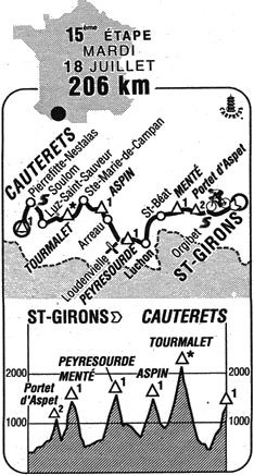 - La course est véritablement lancée en bas du col de Peyresourde sur des attaques de Virenque. Sommet au km 91 : Virenque passe en tête avec 1'08" sur un groupe composé de Chiappucci, Buenahora, Mauri, Hamburger, Escartin, Dufaux, Aparicio, à 2'15" le peloton du maillot jaune.
