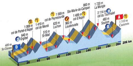 10h36 (Ariège) : Saint-Girons/Champ de Mars - D618 (km 0) - Engomer (km 6) - Andressein (km 11) - Illartein (km 16) - Orgibet (km 19-sprint) - Saint-Lary (km 23) - (Haute-Garonne) : Portet d'Aspet (km 26.5) - Col de Portet d'Aspet (km 29-GPM2) - Pont de l'Oule (km 33.5) - Ger-de-Boutx (km 38.5) - Col de Menté-Le Moutis (km 45.5-GPM1) - Saint-Béat (km 57) - Luchon (km 75.5) - Saint-Aventin (km 82) - Cazeaux-Larboust (km 83.5) - Col de Peyresourde (km 91-GPM1) - (Hautes-Pyrénées) : Estarvielle (km 98.5) - Loudenvielle (km 102.5-ravitaillement) - Ardevielle-Pouchergues (km 105) - Vielle-Louron (km 106.5) - Bordères-Louron (km 111.5) - Arreau (km 116) - Col d'Aspin (km 129.5-GPM1) - Payolle (km 135) - Sainte-Marie-de-Campan (km 142.5) - Gripp (km 146.5) - La Mongie (km 155) - Col du Tourmalet (km 159.5-GPM.HC) - Barèges (km 170) - Luz-Saint-Sauveur (km 177.5) - Soulom (km189.5-sprint) - Pierrefitte-Nestalas (km 190) - Cauterets/Crête du Lys (km 206-GPM1).
