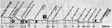 11h00 (Pyrénées-Atlantiques) : Pau/Palais des Sports - D943 (km 0) - Morlaas (km 6.5) - Saint-Laurent-Bretagne (km 13.5) - Simacourbe (km 22) - Côte de Lembaye (km 27.5-GPM4) - Arricau-Bordes (km 33.5) - Cadillon (km 36.5) - Diusse (km 42) - (Gers) : Aurensan (km 48.5) - Côte d'Aurensan (km 51.5-GPM4) - Saint-Mont (km 58-sprint) - Riscle (km 63) - Urgosse (km 74.5) - Nogaro (km 76) - Caupenne d'Armagnac (km 83) - Laujuzan (km 86.5) - Montlezun d'Armagnac (km 90.5) - Montclar d'Armagnac (km 104.5) - (Landes) : Notre-Dame des cyclistes (km 111) - Labastide d'Armagnac (km 113.5-ravitaillement) - Saint-Justin (km 117.5) - Roquefort (km 127.5) - Traverses (km 144.5) - (Gironde) : Captieux (km 157.5) - Bernos-Beaulac (km 167) - Langon (km 189) - Saint-Maixant (km 194.5) - Loupiac (km 201.5) - Cadillac (km 203.5) - Rions (km 207.5) - Paillet (km 210) - Langoiran (km 213.5) - Baurech (km 218) - Cambes (km 220) - Latresnes (km 227-sprint) - D113 Floirac (km 233) - Bordeaux/entrée (km 233.5) - Bruges (km 241.5) - Bordeaux/Cours Jules Ladoumègue (km 246).