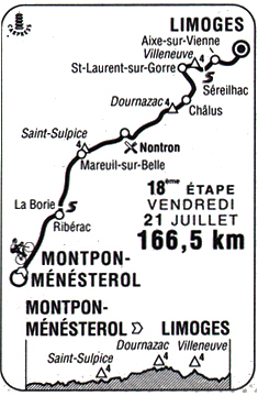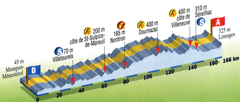 13h00 (Dordogne) : Montpon-Ménestrol/Pl. des Trois-frères Laplagne - D708 (km 0) - Saint-Barthélémy-de-Bellegarde (km 6) - Echourgnac (km 11.5) - La Jemaye (km 18.5) - Vanxains (km 24) - Ribérac (km 30) - Villetoureix (km 32.5-sprint) - Bertric-Burée (près de) (km 38) - Verteillac (km 43) - Mareuil-sur-Belle (km 56.5) - Côte de Saint-Sulpice-de-Mareuil (km 61-GPM4) - Saint-Sulpice-de-Mareuil (km 62.5) - Rudeau (km 67) - Nontron (km 79-ravitaillement) - La Chapelle-Verlaine (km 96) - Les-Trois-Cerisiers (km 104) - (Haute-Vienne) : Côte de Dournazac (km 108.5-GPM4) - Chalus (km 115) - Pageas (près de) (km 119) - Gorre (km 128) - Saint-Laurent-sur-Gorre (km 131.5) - Côte de Villeneuve (km 137.5-GPM4) - Séreilhac (km 142-sprint) - Aixe-sur-Vienne (km 146.5) - Isle (km 156.5) - Limoges/Technopole Ester (km 166.5).