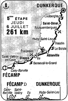 - Une chute se produit à l'entrée de Dunkerque, touchant De las Cuevas entr'autres. Le sprint devenu inévitable est remporté par Blijlevens avec une large avance sur l'horaire prévu (vent favorable). Gotti conserve son maillot jaune.