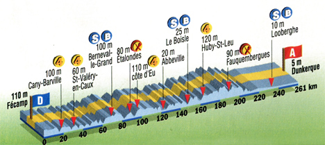 10h50 (Seine-Maritime) : Fécamp/Quai de Vauban - D925 Senneville (km 0) - Ouainville (km 12) - Côte de Cany-Barville (km 18.5-GPM4) - Saint-Valéry-en-Caux (km 26.5) - Côte de Saint-Valéry-en-Caux (km 30-GPM4) - La Chapelle-sur-Dun (km 39.5) - Dieppe (km 58) - Neuville-lès-Dieppe (km 64.5) - Berneval-le-Grand (km 70-sprint) - Saint-Martin-en-Campagne (km 73) - Étalondes (km 88.5-ravitaillement) - Eu (km 91) - Côte d'Eu (km 97-GPM4) - (Somme) : Yzengremer (km 101) - Valines (km 108.5) - Miannay (km 116) - Cambron (km 121) - Le Plessiel (km 130) - Froyelles (km 140.5) - Le Boisle (km 148-sprint) - (Pas-de-Calais) : La Broye (km 148) - Hauteville-Caumont (km 151.5) - Hesdin (km 160) - Côte de Huby-Saint-Leu (km 163.5-GPM4) - Ruisseauville (km 175) - Fauquembergues (km 189.5-ravitaillement) - Avroult (km 194.5) - Cléty - Bientques - Wizernes (km 205) - Saint-Omer (km 210) - (Nord) : Watten (km 220.5) - Looberghe (km 233.5-sprint) - Spycker (près de) (km 241.5) - Grande-Synthe (km 246.5) - Dunkerque/entrée (km 250.5) - Dunkerque/Pl. du Centenaire/digue de la mer (km 261).