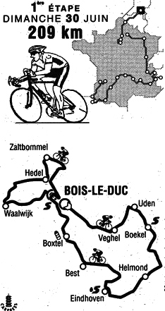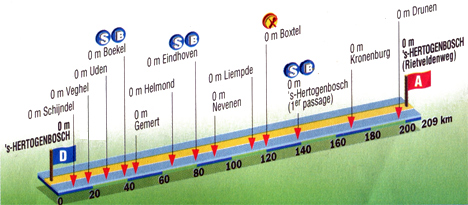 12h34 (PAYS-BAS) - (Brabant du Nord) : s'Hertogenbosch/Bois-le-Duc/Brabanthallen - s'Hertogenbosch/Pl. du Marché (km 0) - Schijndel (km 8.5) - Wijbosch (km 12.5) - Veghel (km 17) - Mariahade (km 23) - Uden (km 28) - Volkel (km 32) - Boekel (km 38-sprint) - Huize-Padua (km 41) - Gemert (km 44.5) - De Mortel (km 49) - Bakel (km 54) - Helmond (km 59.5) - Mierlo (km 69.5) - Geldrop (km 74) - Eindhoven (km 79-sprint) - Eindhoven/sortie (km 87) - Nevenen (km 89.5) - Son-en-Bruegel (km 96) - Liempde (km 111) - Boxtel (km 120-ravitaillement) - St-Michielsgesten (km 125.5) - s'Hertogenbosch/entrée (km 131.5) - s'Hertogenbosch/1er passage (km 137.5) - s'Hertogenbosch/sortie (km 141.5) - Hedel (km 147) - Velddriel (km 150) - Kerkdriel (km 152.5) - Zaltbommel (km 161) - Kronenburg (km 168) - Heudenskanaal (km 178.5) - Waalwijk (km 190) - Drunen (km 195.5) - Niewkwijk (km 199) - Engelen (km 206.5) - s'Hertogenbosch/Rietvelden (km 209).
