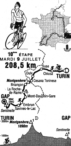 Dans l'ascension du col de Montgenèvre, Madouas perd contact mais l'écart grandit malgré une réaction des Mapei. A la frontière au km 93, l'écart culmine à 3'15", Ullrich est virtuel maillot jaune. Au sommet au km 95 : Virenque, Ugrumov, Ullrich, à 2'40" Madouas, à 3'10" le peloton.