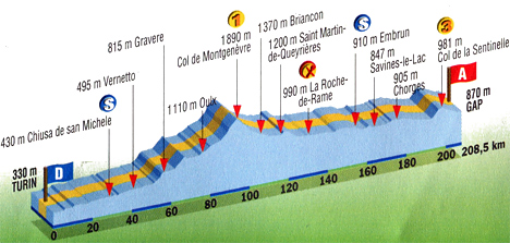 12h00 (ITALIE) - Turin/Via Nizza - Turin/Corza Vittorio Emmanuele II (km 0) - SS25 Collegno (km 7) - Rivoli (km 9.5) - Avigliana (km 21) - Chiusa de San Michele (km 2-sprint) - Vaie (km 30.5) - Villar Focchiardo (km 34.5) - Borgone (km 36.5) - Vernetto (km 41.5) - Busselono (km 43.5) - San Giuliano (km 49) - SS24 Gravere (km 56.5) - Chiomonte (km 58.5) - Exilles (km 64.5) - Salbertrand (km 70.5) - Oulx (km 76.5) - Mollières (km 85.5) - Claviere (km 92.5) - (FRANCE) - (Hautes-Alpes) : N94 Col de Montgenèvre (km 95-GPM1) - Briançon (km 106.5) - Chamandrin (km 111.5) - Saint-Martin-de-Queyrières (km 116.5) - Largentière-la-Bessée (km 123) - La-Roche-de-Rame (km 129) - Saint-Clément-sur-Durance (km 142.5) - Châteauroux-les-Alpes (km 148.5) - Embrun (km 155) - Savines-le-Lac (km 164.5) - Chorges (km 176.5) - D942 Valserres (près de) (km 193) - Jarjayes (km 197.5) - Col de la Sentinelle (km 198.5) - Gap/Av. d'Embrun (km 208.5).
