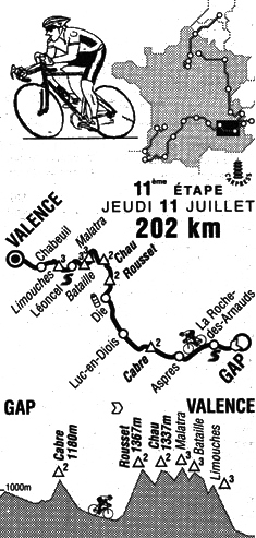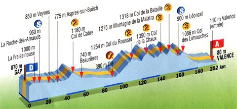 12h06 (Hautes-Alpes) : Gap/Av. Maréchal Foch - D994 (km 0) - La Freissinouse (km 5.5) - La-Roche-des-Arnauds (km 11-sprint) - Veynes (km 21.5) - D994A Aspres-sur-Buëch (km 31) - La Beaume (km 42.5) - Col de Cabre (km 47.5-GPM2) - (Drôme) : D93 Beaurières (km 56.5) - Luc-en-Diois (km 71.5) - Montlaur-en-Diois (km 74.5) - Recoubeau (km 77) - Die (km 89.5-ravitaillement) - D518 Chamaloc (km 97) - Col du Rousset (km 111.5-GPM2) - D76 Vassieux-en-Vercors (km 120.5) - Col de la Chaux (km 125.5-GPM2) - D199 Col de la Portette (km 137.5) - Montagne de la Malatra (km 142.5-GPM3) - Col de la Bataille (km 152-GPM3) - Léoncel (km 160.5) - D68 Col des Limouches (km 166) - Chabeuil (km 185) - N1532 (km 192.5) - Valence/Pl. du Général Leclerc (km 202).