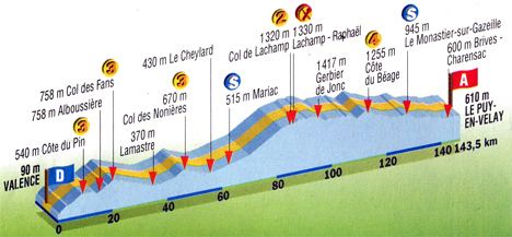 13h52 (Drôme) : Valence/Esplanade Jean Pic - D533 (km 0) - (Ardèche) : Saint-Peray (km 0.5) - Côte du Pin (km 9.5-GPM3) - Alboussière (km 15) - Col de la Rouveure (km 17) - Col des Fans (km 25-GPM3 ) - Grozon (km 23) - Saint-Barthélémy-le-Pin (km 26.5) - Lamastre (km 33.5) - D578 Lapras (km 39) - Nonières (km 45) - Col des Nonières (km 45.5-GPM3) - Le Cheylard (km 54) - Accons (km 58.5) - Mariac (km 60.5) - Dornas (km 65.5) - Mézilhac (km 78) - D122 Col de Lachamp (km 82.5) - Lachamp-Raphaël (km 83.5-ravitaillement) - D378 Gerbier-de-Jonc (km 92.5) - D122 Le Béage (km 104) - Côte du Béage (km 110-GPM4) - (Haute-Loire) : D535 Crouziols (km 117) - D500 Le Monastier-sur-Gazeilles (km 124) - D535 La Terrasse (km 129.5) - Arsac-en-Velay (km 131.5) - Brive-Charensac (km 138.5) - Le Puy-en-Velay/Place de Breuil (km 143.5).