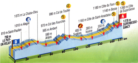 Ariane (km 51) - Ambert (km 69.5) - Col des Fourches (km 82-GPM3) - Saint-Amant-Roche-Savine (km 83) - Col de Toutée (km 89.5-GPM4) - Auzelles (km 96.5) - Sugères (km 109-ravitaillement) - Sauxillanges (km 116) - Varennes-sur-Usson (km 123) - Parentignat (km 124.5) - Issoire (km 127.5) - Perrier (km 132) - D26 Chidrac (km 137) - Saint-Floret (km 140.5) - Saurier (km 146.5-sprint) - Courgoul (km 149.5) - Valbeleix (km 158) - Sainte-Anastaise (km 161.5) - Côte de Sainte-Anastaise (km 163.5) - Besse (km 169) - D149 Le Faux (km 170.5) - Côte du Faux (km 171.5-GPM3) - Côte de Superbesse (km 175-GPM3) - Superbesse-Sancy (km 177).