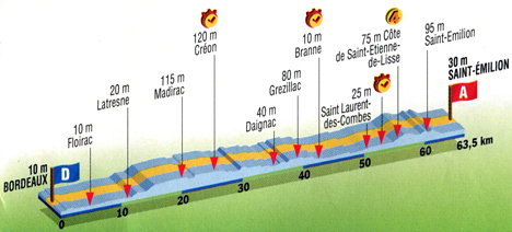 10h52 (Gironde) : Bordeaux/Pl. des Quinquonces (km 0) - D113 Floirac (km 4.5) - Latresnes (km 10.5) - D14 Camblanes (km 12) - Madirac (km 19) - Créon (km 24.5-chrono) - D671 La Sauve (km 27) - D239 Daignac (km 33.5) - D11 Grézillac (km 37.5) - D936 Branne (km 45-chrono) - Saint-Laurent (km 48.5) - D245/D130 Saint-Étienne-de-Lisse (km 53-GPM4-chrono) - D243 Saint-Chrostophe-des-Bardes (km 55) - Saint-Émilion (km 57.5) - D670 Saint-Émilion (km 63.5).
