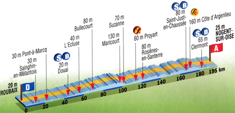11h45 (Nord) : Tourcoing/Centre Mercure - Roubaix - Croix - Wasquehal/Rue J. Jaurès (km 0) - Forest-sur-Marque (km 3.5) - Villeneuve-d'Ascq (km 6) - Sainghin-en-Mélantois (km 9.5) - Péronne-en-Mélantois (km 13) - Fretin (km 14.5) - Ennevillin / pont Thibault (km 20) - Pont-à-Marcq (km 21) - Bersée (km 26.5) - Faumont (km 29) - Raimbeaucourt (km 32.5) - Râches (km 33.5) - Douai (km 43-sprint) - Courchelettes (km 45) - Ferin (km 47) - (Pas-de-Calais) : Gouy-sous-Bellonne (km 51) - Tortequesne (km 53.5) - (Nord) : L'Écluse (lieu-dit) (km 54) - (Pas-de-Calais) : Dury (km 59) - Hendecourt-les-Cagnicourt (km 65) - Bullecourt (km 67.5) - Ecoust-Saint-Mein (km 69.5) - Vaulx-Vraucourt (km 73.5) - Beugnâtre (km 76.5) - Bapaume (km 79) - Ligny-Thilloy (km 82) - (Somme) : Flers (km 87) - Longueval (km 90) - Maricourt (km 95.5) - Suzanne (km 99) - Cappy (km 102.5) - Bray-sur-Somme (km 104.5) - Proyart (km 111.5-ravitaillement) - Framerville-Rainecourt (km 114) - Vauvillers (km 116) - Rosières-en-Santerre (km 119) - Vrely (km 121.5) - Warvillers (km 124) - Folies (km 127) - Erches (km 130.5) - Guerbigny (km 133) - Montdidier (km 142) - Ayencourt-le-Monchel (km 146) - (Oise) : D929 Royaucourt (km 149) - Ferrières (km 151) - Crèvecoeur-le-Petit (km 153) - D938 Saint- Just-en-Chaussée (km 163-sprint) - D916 Côte d'Argenlieu (km 167-GPM4) - Argenlieu (km 169.5) - Airion (près) (km 174) - Fitz- James (km 177) - Clermont (km 178.5) - N16 Breuil-le-Vert (km 180) - Laigneville (près) (km 187) - Creil (km 192.5) - Nogent-sur-Oise (km 195).