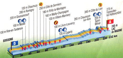 11h57 (Aisne) : Soissons/Pl. Saint-Christophe - D6 Belleu (km 0) - Fère-en-Tardennois (km 23) - D2 Nesles (km 29-sprint) - Goussancourt (km 37.5) - (Marne) : D980 Romigny (km 49.5) - Ville-en-Tardenois (km 51.5) - D386 Chaumuzy (km 57) - Marfaux (km 59.5) - D22 Côte de Sermiers (km 64.5-GPM4) - D26 Sermiers (km 68) - Villers-Allerand (km 71.5) - Rilly-la-Montagne (km 73) - Chigny-les-Roses (km 75) - Mailly-Champagne (km 78.5) - Verzenay (km 81) - Verzy (km 83.5) - Villers-Marmery (km 87) - D37 Sept-Saulx (km 92) - D8 Mourmelon-le-Petit (km 97.5) - D19 Livry-Louvercy (km 100-ravitaillement) - D994 Bouy (km 104) - Vadenay (km 108) - Cuperly (km 111-sprint) - (Meuse) : La Grande Romanie (km 124.5) - Nettancourt (km 155) - D902 Laheycourt (km 163) - Lisle-en-Barrois (km 171.5) - Rembercourt Sommaine (km 176.5) - N35 Chaumont-sur-Aire (km 183) - D901 Fresnes-au-Mont (km 199) - Chauvoncourt (km 204.5) - Saint-Mihiel (km 206-sprint) - Côte du Lion (km 210-GPM3) - Chaillon (km 218) - Creue (km 221) - Vigneulles-les-Hattonchâtel (km 224) - Lac de Madine (km 232).
