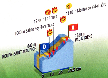 10h40 (Savoie) : N90 Bourg-Saint-Maurice/gare routière (km 0) - Séez (km 2) - D902 Sainte-Foy-Tarentaise (km 11.5-chrono) - La Thuile (km 14.5-ravitaillement-chrono) - Montée de Val d'Isère (km 24-chrono) - Val d'Isère/La Daille (km 28.5) - Val d'Isère (km 30.5).