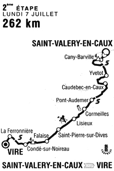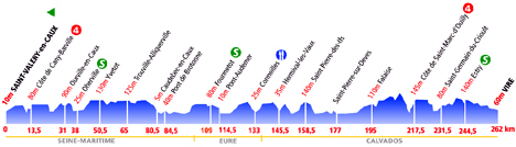 10h45 (Seine-Maritime) : D53 St-Valéry en Caux (km 0) - Cany-Barville (km 11) - Côte de Cany-Barville (km 13.5-GPM4) - Valmont (km 23) - Riville (km 28) - Ourville-en-Caux (km 31) - Le Hanouard (km 35.5) - Oherville (km 38-sprint) - Héricourt-en-Caux (km 41) - Autretot (km 47) - Yvetot (km 50.5) - Allouville-Bellefosse (km 58.5) - Trouville-Alliquerville (km 65) - Auberville-la-Campagne (km 69) - Saint-Arnoult (km 75) - Caudebec-en-Caux (km 80.5) - Pont-de-Brotonne (km 84.5) - (Eure) : Bourneville (km 105) - Fourmetot (km 109-sprint) - Manneville-sur-Risle (km 112.5) - Saint-Germain-Village (km 117) - Epaignes (km 126.5) - Corneilles (km 133-ravitaillement) - (Calvados) : Hermival-les-Vaux (km 145.5) - Lisieux (km 149) - Saint-Désir-de-Lisieux (km 153) - Saint-Pierre-des-Ifs (km 158.5) - Saint-Julien-le-Faucon (km 165.5) - Saint-Pierre-sur-Dives (km 177) - Jort (km 183) - Falaise (km 195) - Pont-d'Ouilly (km 214.5) - Côte de Saint-Marc-d'Ouilly (km 217.5-GPM4) - Saint-Denis-de-Méré (km 224.5) - Condé-sur-Noireau (km 226.5) - Saint-Germain-du-Crioult (km 231.5) - Le Theil-Bocage (km 242) - Estry (km 244-sprint) - Montchamp (km 248) - Saint-Charles-de-Percy (km 250) - La Ferronnière (km 252) - Beaulieu (km 253.5) - Vire/R. de Caen (km 262).