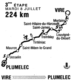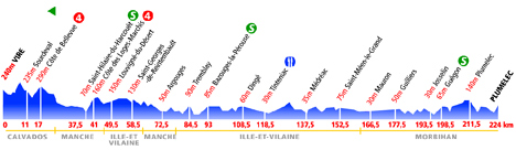 11h41 (Calvados) : D577 Vire (km 0) - Saint-Germain-de-Tallevende (km 2.5) - (Manche) : Sourdeval (km 11) - Côte de Bellevue (km 17-GPM4) - Le Neufbourg (km 20.5) - Mortain (km 21.5) - Parigny (km 35) - Saint-Hilaire-du-Harcouët (km 37.5-sprint) - Côte des Loges-Marchis (km 41-GPM4) - Les Loges-Marchis (km 41.5) - (Ile-et-Vilaine) : Louvigné-du-Désert (km 49.5) - Mellé (km 54.5) - Saint-Georges-de-Réintembault (km 58.5) - (Manche) : Saint-James (km 65.5) - Argouges (km 72.5) - (Ille-Et-Vilaine) : Saint-Ouen-en-Rouërie (près de) (km 78.5) - Tremblay (km 84.5) - Bazouges-la-Pérouse (km 93-sprint) - Noyal-sous-Bazouges (km 98.5) - Saint-Léger-des-Prés (km 102) - Dingé (km 108.5) - Tinténiac (km 118.5-ravitaillement) - La Baussaine (km 123.5) - Bécherel (km 127.5) - Médréac (km 137.5) - Quédillac (km 144) - Saint-Méen-le-Grand (km 152.5) - Gaël (près de) (km 159) - (Morbihan) : Mauron (km 166.5) - Coudray-Baillet (km 172.5) - Guilliers (km 177.5) - Saint-Malo-des-Trois-Fontaines (km 184.5) - Chapeau rouge (km 190.5) - Josselin (km 193.5) - Guégon (km 198.5-sprint) - Cruguet (près) (km 206.5) - Plumelec (km 211.5) - Le Bissac (km 215) - La Poche (km 215) - La Cour Penclen (km 216.5) - Kermado (km 217) - La Folle-Pensée-Lanvaux (km 218.5) - Kerlano (km 219) - Kerboyen (km 221) - Cadoudal (km 222) - Lougour (km 223) - Plumelec / D126 (km 224).