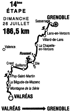 - L'avance des six atteint 8'15" au ravitaillement de Die (km 85), 9'40" au pied du col de Rousset (km 92). Au sommet du col, les fuyards menés par O'Grady, comptent 9' d'avance. Dans le peloton, les Telekom assurent un tempo léger et l'écart culmine maintenant à 12' à St-Julien en Vercors (km 138). Guesdon et Diaz s'intercalent juste avant Lans en Vercors à 30 bornes du but.