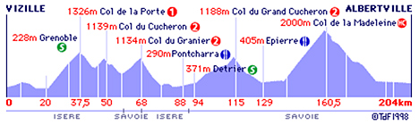 - Dans les cols de La Chartreuse, les échappés maintiennent une bonne avance et Stéphane Heulot passent les sommets en tête. Derrière, un groupe de contre-attaque se forme avec Bordenave, Verbrugghe, Solaun mais ils ne peuvent réaliser la jonction et sont repris au premier ravitaillement de Pontcharra (km 88.5). A Épierre (km 129), les échappés comptent 6'30" d'avance sur le peloton. Dès les premières pentes du col de La Madeleine, Stéphane Heulot lâche ses compagnons Teteriouk et Aldag. Dans le peloton, au premier tiers de l'ascension, Ullrich accélère à plusieurs reprises et ne restent dans sa roue que Pantani, Piepoli et Escartin. Ces deux derniers cèdent rapidement et laissent Ullrich et Pantani en tête à tête. L'Allemand fait toute la montée en tête avec Pantani sur son porte-bagage. Teteriouk et Aldag sont rejoints et déposés. A 8 km du sommet, Heulot est repris et également lâché. Au col de la Madeleine (km 160.5), Ullrich passe en tête, Pantani dans sa roue, à 2'12" le groupe Julich / Escartin.