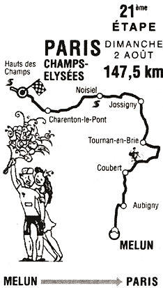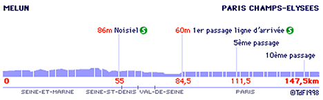 13h34 (Seine-et-Marne) : Melun (km 0) - Voisenon (km 1.5) - Montereau-sur-le-Jard (km 4) - Aubigny (km 6.5) - Lissy (km 10) - Soignolles-en-Brie (km 13) - Coubert (km 15) - Liverdy-en-Brie (km 22) - Châtres (km 25.5) - Tournan-en-Brie (km 31) - Favières (km 34.5) - Jossigny (km 43.5) - Guermantes (km 47) - Gouvernes (km 48) - Saint-Thibault-des-Vignes (km 51) - Torcy (km 52.5) - Noisiel (km 55-sprint) - Champs-sur-Marne (km 56) - (Seine-St-Denis) : Noisy-le-Grand (km 59.5) - (Val-de-Marne) : Villiers-sur-Marne (km 63) - Bry-sur-Mame (km 65) - Champigny-sur-Marne (km 65.5) - Joinville-le-Pont (km 69) - Saint-Maurice (km 70) - Charenton-le-Pont (km 70.5) - (Paris) : Quai de Bercy (km 78) - Quai de la Râpée (km 79) - Boulevard Henri-lV (km 79.5) - Place de la Bastille (km 80) - Rue de Rivoli (km 81) - Hôtel de Ville (km 81.5) - Entrée du circuit (km 83) - 1er passage (km 84.5) - Hauts des Champs (km 86) - 2ème passage (km 91- sprint) - ... - 10ème passage (km 141) - Hauts des Champs (km 143.5) - Paris/Champs-Elysées (km 147.5).