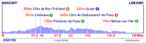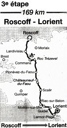 13h25 (Finistère) : Roscoff - Roscoff (km 0) - Saint-Pol-de-Léon (près de) (km 3.5) - Plouvorn (km 15.5) - Landivisiau (km 23) - Lampaul-Guimiliau (km 28) - Saint-Sauveur (km 34) - Commana (km 39.5-sprint) - Côte de Roc-Trévézel (km 46-GPM4) - La Feuillée (près de) (km 49) - Brennilis (km 53.5) - Loquefret (km 59) - Plovénez-du-Faou (km 67.5-sprint) - Châteauneuf-du-Faou (km 74) - Côte de Châteauneuf-du-Faou (km 82-GPM3) - Scaër (km 102-ravitaillement) - Bannalec (km 111.5) - Riec-sur-Bélon (km 123) - Moëlan-sur-Mer (km 130-sprint) - Clohars-Carnoël (km 134.5) - (Morbihan) : Guidel (km 143) - Guidel-Plage (km 147) - Fort-Bloqué / Plœmeur (km 152) - Larmor-plage (près de) (km 160.5) - entrée Lorient (km 165) - Lorient (km 169).