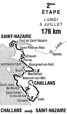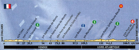 13h10 (Vendée) : D58 Challans (km 0) - D21 Apremont (km 12) - D40 Coex (km 19) - D32 La Chaize-Giraud (km 27) - D38 Givrand km 35.5-sprint) - Saint-Gilles-Croix-de-Vie (km 37) - D38bis Saint-Hilaire-de-Riez (près de (km 42.5) - D38 Saint-Jean-de-Monts (km 54) - Notre-Dame-de-Monts (km 63) - D38bis Pont de Noirmoutier (km 73.5) - D38 Barbatre (près de) (km 78) - D948 entrée Passage du Gois (km 80) - sortie Passage du Gois (km 84) - Beauvoir-sur-Mer (km 88) - D758 Bouin (km 97.5) - (Loire-Atlantique) : D64 Machecoul (km 109.5-sprint) - D13 Fresnay-en-Retz (km 115) - Bourgneuf-en-Retz (km 121) - La Bernerie-en-Retz (km 129) - Pornic (km 133.5) - D6 Le Clion-sur-Mer (km 135) - Chauvé (km 142.5-sprint) - D58 Saint-Père-en-Retz (km 149.5) - D5 Saint-Brévin-les-Pins (km 161) - D213 Pont de Saint-Nazaire (km 166.5) - N471 Saint-Nazaire / Av. Leo Lagrange (km 176).